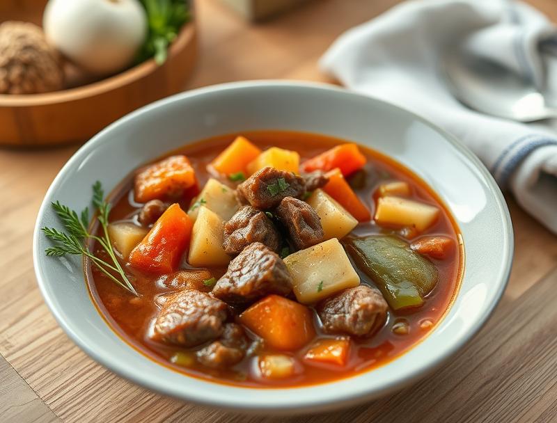 A hearty and comforting soup made with beef, vegetables, and aromatic spices, perfect for a quick and easy homemade dinner.