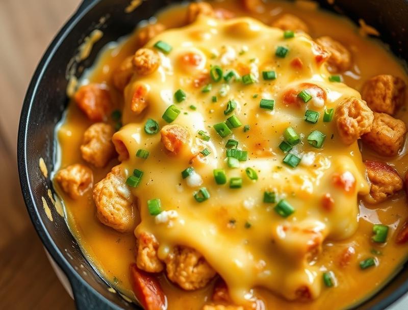 A delicious and easy-to-make skillet dish combining chicken, cheese, and con queso sauce, perfect for weeknights or special occasions.