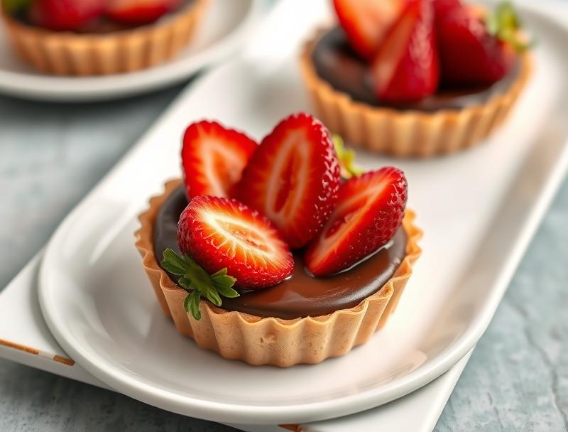 A simple yet elegant dessert featuring homemade tart shells filled with rich chocolate and fresh strawberries.