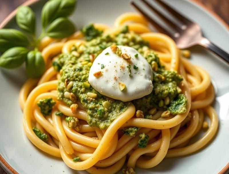 • The balance of flavors between the creamy sauce, the vibrant basil-pistachio pesto, and the soft burrata cheese creates a harmonious taste experience that is both comforting and sophisticated.