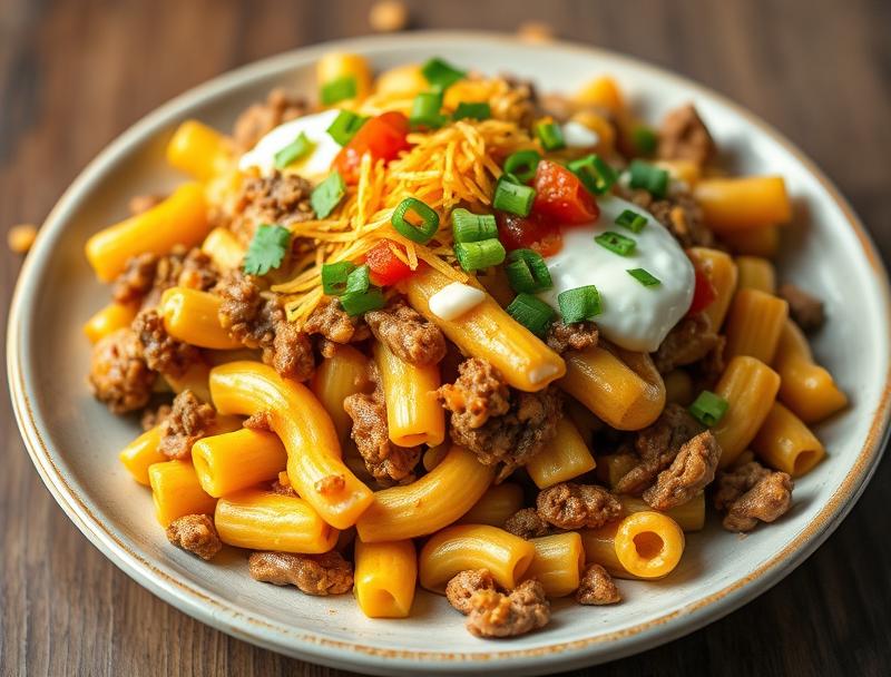 A creamy, cheesy, and flavorful twist on traditional macaroni dishes, combining ground beef, taco seasoning, macaroni, and a rich cheese sauce.