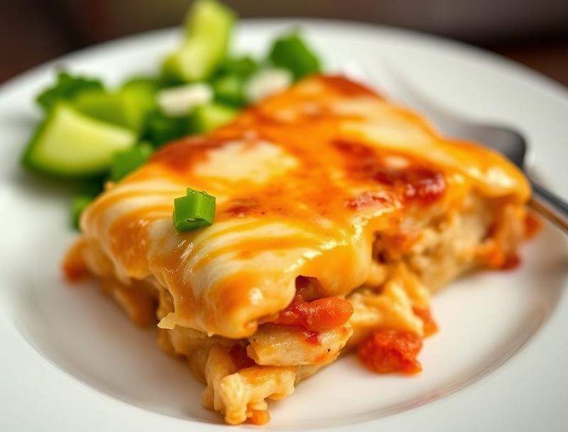 - Step 3: Assemble the Casserole – In a 9×13 inch baking dish, spread a thin layer of enchilada sauce on the bottom. Dip a tortilla in the enchilada sauce to coat both sides, then fill with some of the cooked chicken and a sprinkle of cheese. Roll the tortilla and place seam-side down in the baking dish. Repeat with the remaining tortillas and chicken. Pour the remaining enchilada sauce over the top of the rolled tortillas and sprinkle with the shredded cheese.