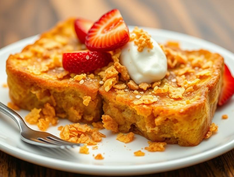 A twist on the classic French toast, featuring a crispy cornflake crust and a soft, fluffy interior, perfect for breakfast or brunch.