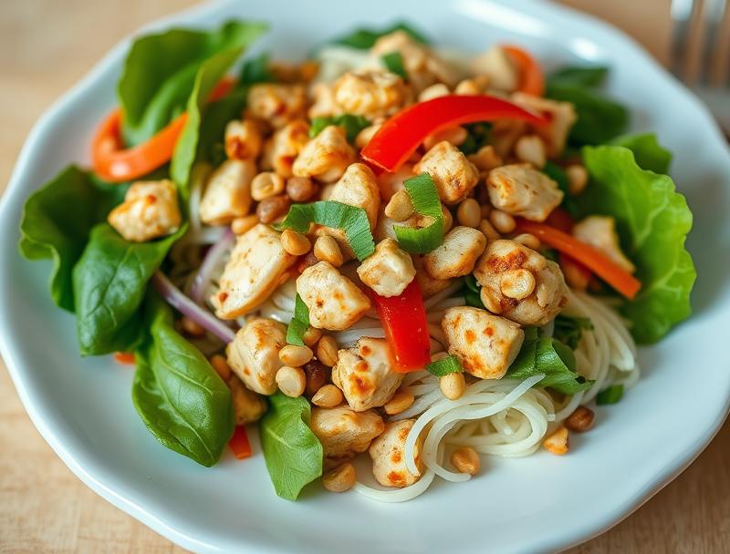 A quick, healthy, and flavorful Asian-inspired chicken salad made with peanut sauce, mixed greens, and crunchy vegetables.