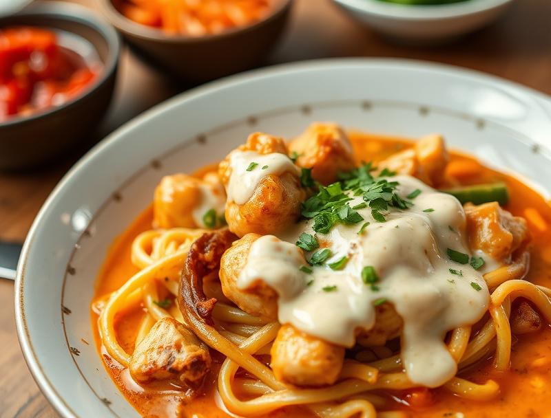 A spicy and savory ramen dish featuring chicken, creamy garlic sauce, and ramen noodles, perfect for a quick and comforting meal.