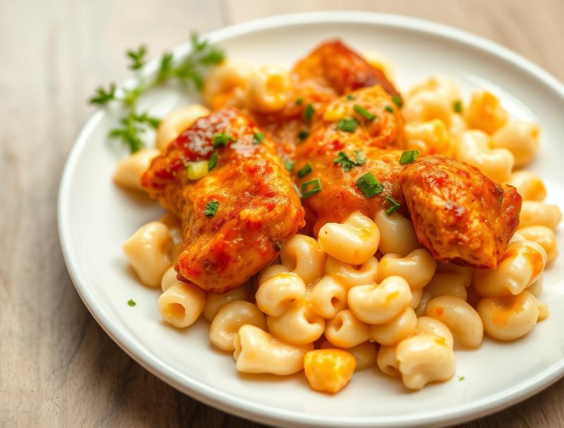 A sweet and spicy chicken dish with creamy macaroni cheese, perfect for a weeknight dinner or special occasion.