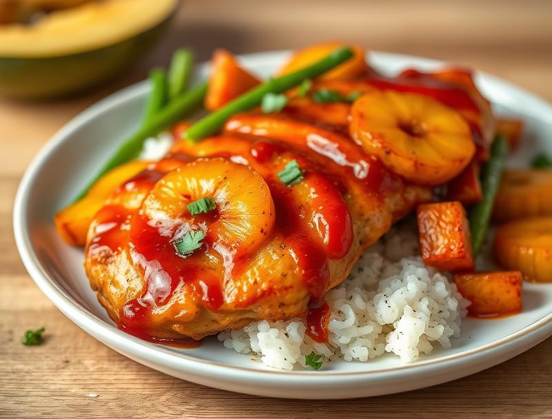A sweet and tangy chicken breast recipe featuring caramelized pineapple and BBQ sauce, perfect for any meal.