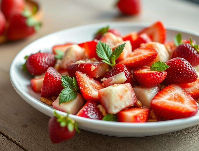A refreshing dessert salad combining the crunch of pretzels, the freshness of strawberries, and the creaminess of a sweet and tangy sauce.